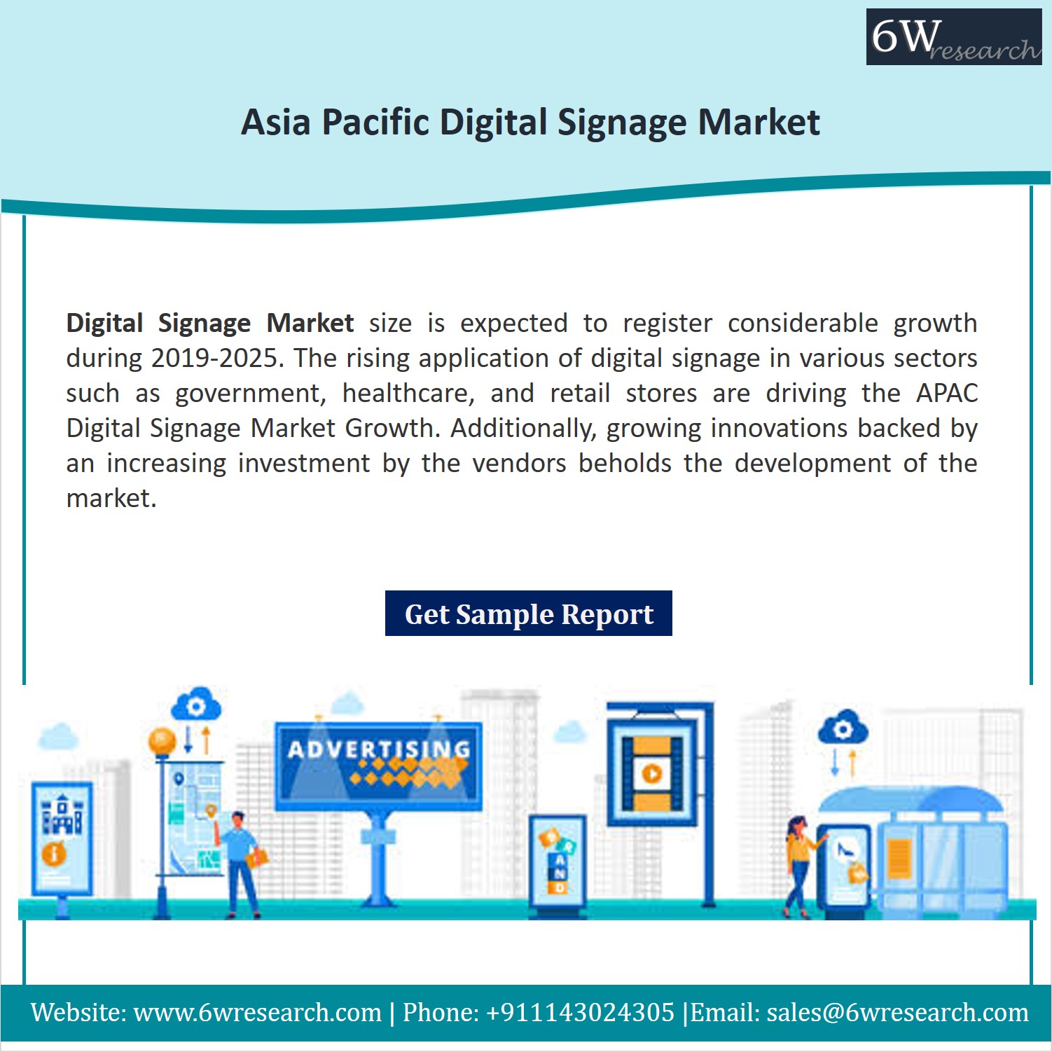 According to 6Wresearch, the Asia Pacific (APAC) Digital Signage Market size is expected to register considerable growth during 2019-2025. The rising application of digital signage in various sectors such as government, healthcare, and retail stores are driving the APAC Digital Signage Market Growth. Additionally, growing innovations backed by an increasing investment by the vendors beholds the development of the market. Low labor cost coupled with less application cost is expected to accelerate the Asia Pacific Digital Signage Market Share. The extensive application of digital signage in the commercial sector is one of the major factors contributing to the development of the market.