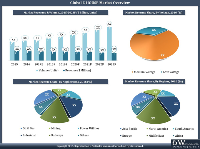 According to 6Wresearch, the Global E-House market size is projected to grow at a CAGR of 8.5% during 2017-23. The development of smart grids and the establishment of nuclear and renewable energy power plants would fuel the market for E-House in the forecast period. The offshore oil & gas sector accounted for the majority of the revenue share in the global E-House market. The mining, rail infrastructure & transportation segments would drive the Global E-House market forecast revenues over the next six years. The global E-House market is dominated by the gas-insulated medium voltage segment in 2016.