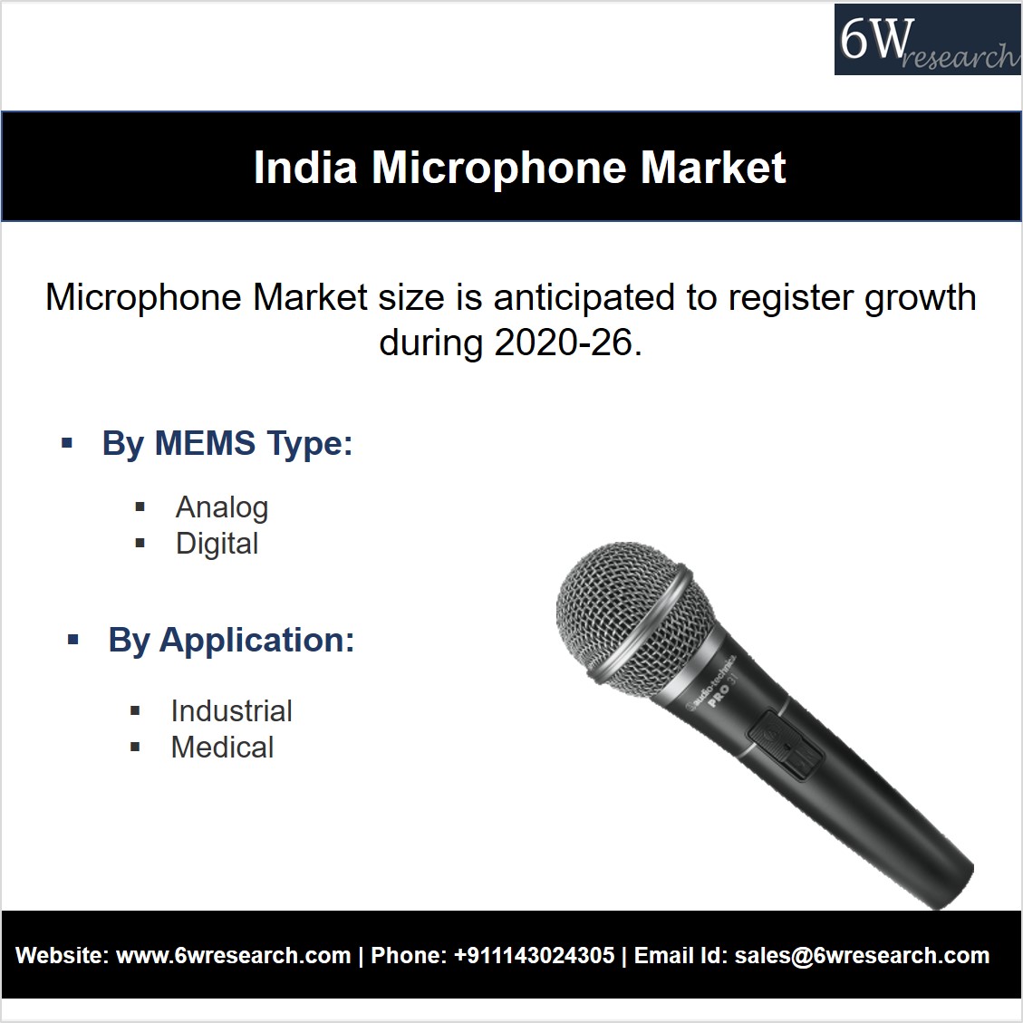 According to 6Wresearch, the India Microphone Market size is anticipated to register growth during 2020-26. The reason being, the booming entertainment industry, IT industry, and public events. Also, India contributes largely to the overall market share. This is mainly because of a huge decrease in the prices of microphones. The increasing competition has also led to an increase in market share. Moreover, India is expected to grow the microphone market at a fast pace in the coming years. Further, the increase in sponsorships investments in sports activities is expected to propel the demand for microphones in India over the forecast period.